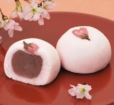(まんじゅう) , a Japanese-style round cake with usually red bean paste inside. Pictured right: Cherry-blossom manju.